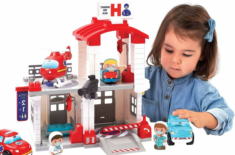 Hôpital à construire sur 2 étages comprenant 3 personnages, 2 véhicules et un hélicoptère. De nombreux accessoires.