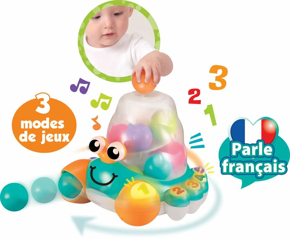 MODE JEU LIBRE : l’enfant insère les balles et lorsqu’il appuie sur un des chiffres, le crabe lance les balles en tournant sur lui-même. Bébé est encouragé à se déplacer pour aller chercher les balles lancées ! MODE DÉCOUVERTE : l’enfant insère les balles et le crabe compte les balles en allumant les boutons des chiffres au fur et à mesure. MODE QUESTION : le crabe dit un chiffre et l’enfant doit le trouver ou le crabe demande à l’enfant d’insérer un certain nombre de balles. 40 musiques, sons et mots.