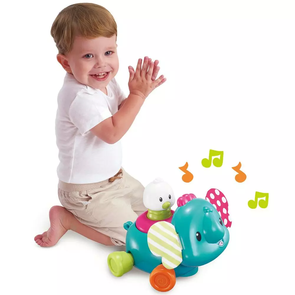Les mélodies et sons joués par le petit éléphanteau, quand il avance et quand on appuie dessus, encouragent l’enfant à le suivre, développant ainsi son ouïe, sa motricité globale et son appréhension de l’espace. Le produit parle en français et fonctionne avec des piles (non fournies).
