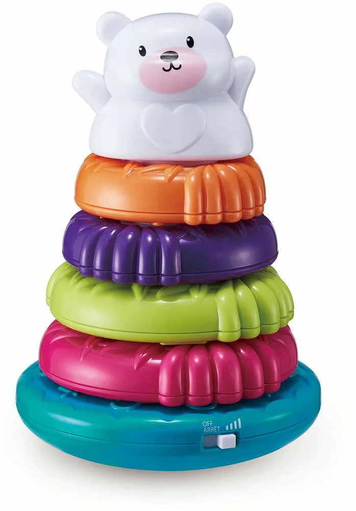 Bébé développe sa motricité en jouant avec son ourson à empiler ! Développement de la motricité fine et de la coordination main-oeil en empilant les anneaux de différentes couleurs et formes sur la tige centrale. Chaque anneau contient de petites billes, pour l’éveil de bébé. Un son retentit à chaque fois que bébé place un anneau, pour l’encourager et lui faire découvrir les relations de cause à effet. Lorsque l’enfant arrive à positionner toutes les pièces, cela déclenche des comptines ! Base culbuto lestée.