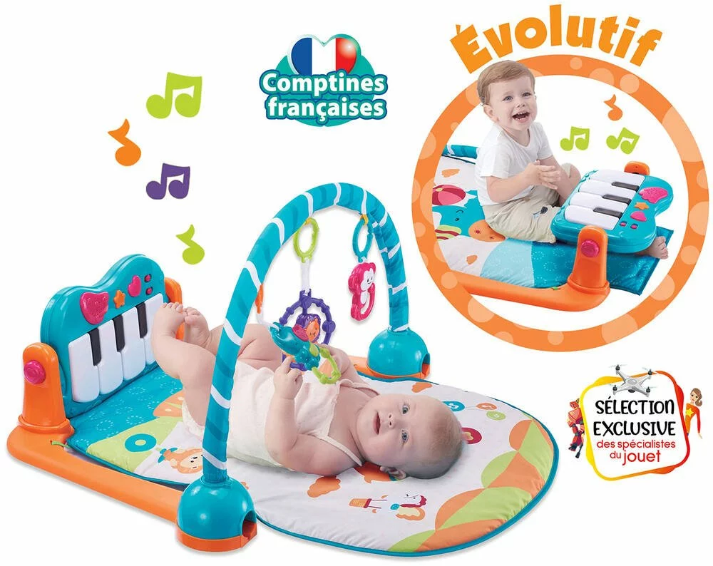 Le tapis Circus Gym est un tapis d’éveil évolutif qui suit votre enfant tout au long de sa croissance et de son éveil ! L’enfant peut y jouer allongé sur le dos, allongé sur le ventre et en position assise ! Il offre de multiples expérience de jeu à l’enfant pour développer son ouïe, sa motricité fine et sa motricité globale ! Il possède une arche de jeu amovible avec 3 hochets également amovibles. Le piano, situé aux pieds de l’enfant, comporte 2 modes de jeu ; un mode note et un mode mélodies avec des comptines françaises, et il est orientable pour que bébé puisse jouer avec en position assise !