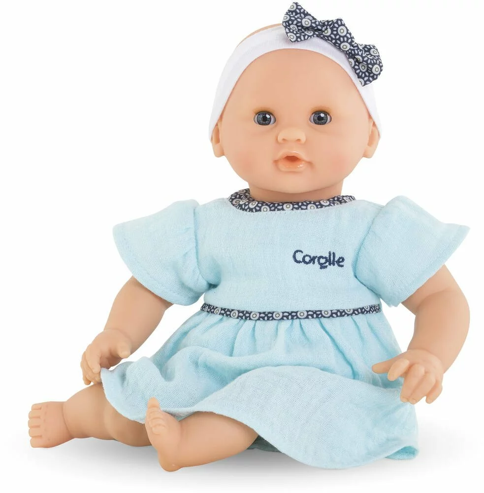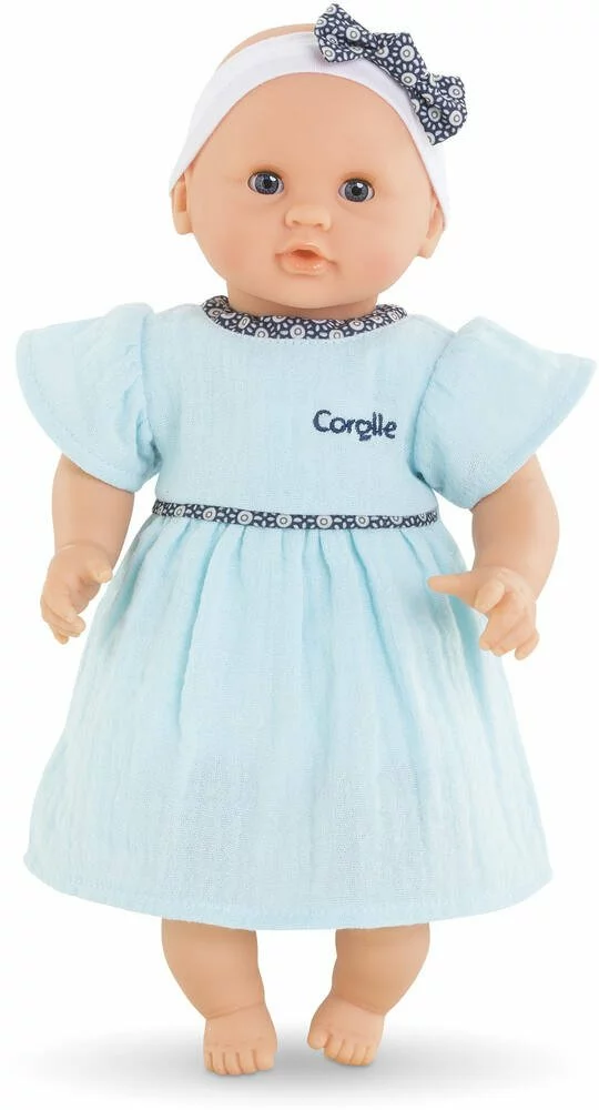 Bébé Câlin Maud est un petit poupon de 30cm; la taille parfaitement adaptée aux petits bras et mains de l’enfant pour le manipuler. Son corps souple lui permet de prendre les mêmes positions qu’un vrai bébé. Son visage; ses bras et ses jambes; à la délicate senteur de vanille; sont en vinyle doux au toucher. Son pouce peut se maintenir dans sa bouche comme un vrai bébé. Avec ses yeux bleus dormeurs; il fait dodo quand on le couche sur le dos. Il est habillé d’une jolie robe bleue et coiffé d’un bandeau assorti. Bébé Câlin Maud dispose d’une collection variée de vêtements et d’accessoires dans la gamme mon premier poupon Corolle pour pouponner pour la première fois. tête et membres: vinyle; corps en Spun Poly 100% Polyester. Rembourrage fibres 100% polyester et billes plastiques . Vêtements en molleton 100% Coton & Polycoton -Tulle argenté & jersey 100% Polyester –