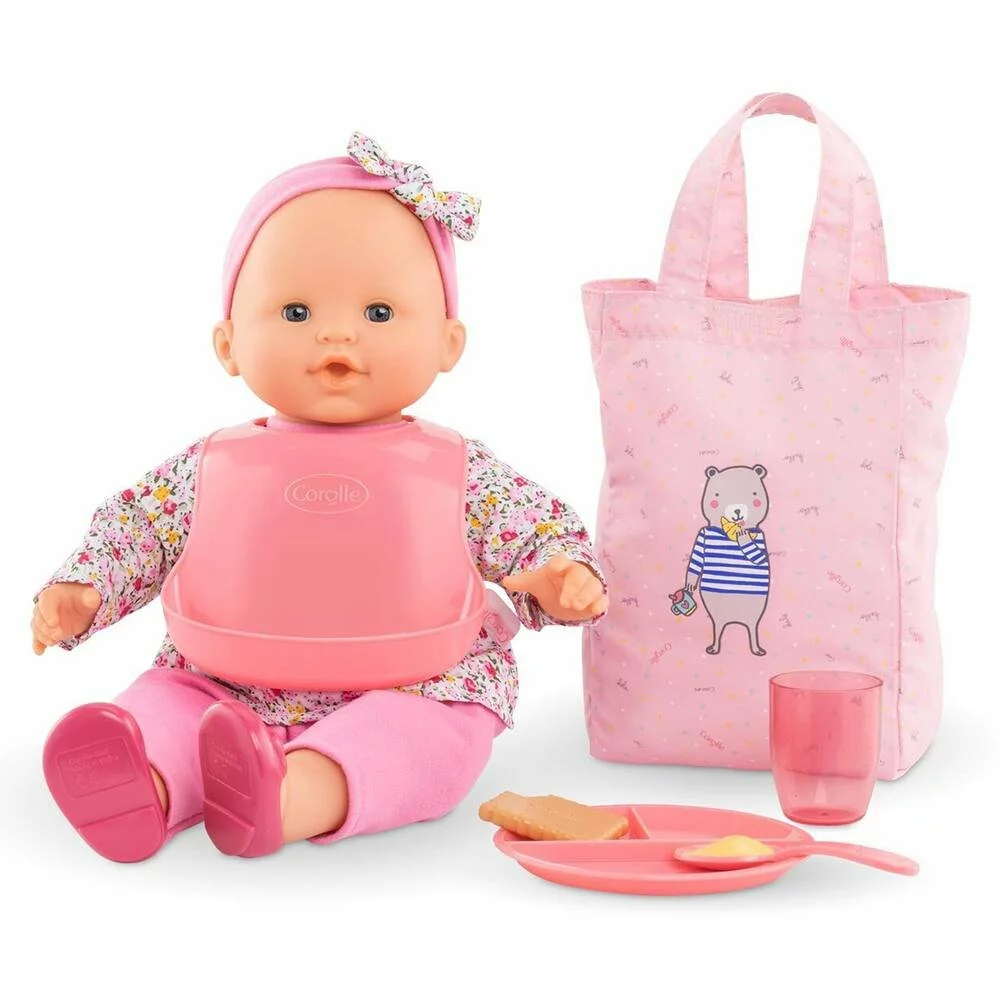 Miam, c’est l’heure du repas ! Le Coffret Repas contient les accessoires indispensables pour le repas des grands poupons : un bavoir à rebord, un biscuit, un verre, une assiette, une cuillère et un sac pour tout ranger. Pour s’occuper de son grand poupon Corolle de 36 à 42 cm comme les grands !