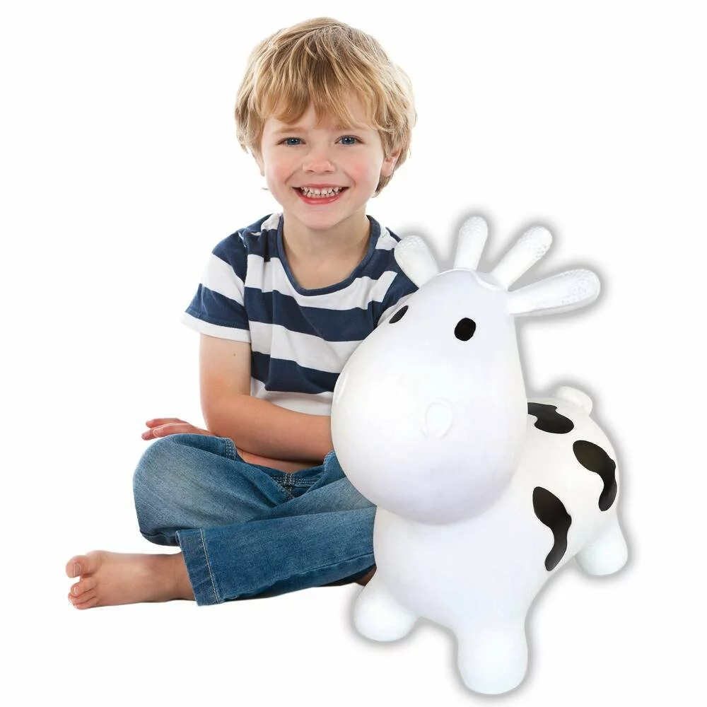 Vache à gonfler. L’enfant peut monter dessus. Hauteur de l’assise : 24 cm. Développe l’équilibre et la coordination. Très résistant. Poids maximum de l’utilisateur : 50 kg.