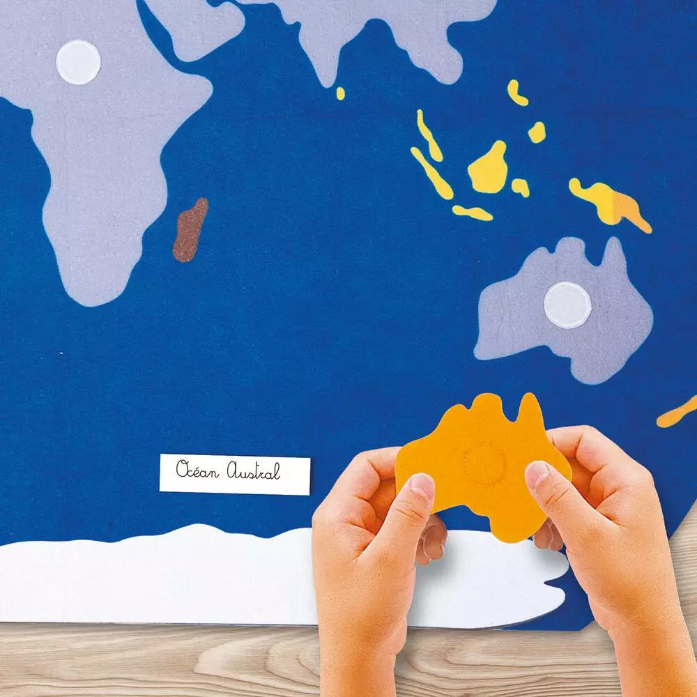 Ce coffret éducatif s’inspire des principes de la Méthode Montessori grâce à la collaboration d’enseignants Montessori. Il contient un planisphère en feutrine à compléter avec les continents et leur nom respectif, à accrocher avec du Velcro. L’enfant pourra également compléter le planisphère avec des photos d’animaux, de monuments ou encore de drapeaux. Le manuel inclus permettra aux parents de comprendre comment proposer les différentes activités à leur enfant.