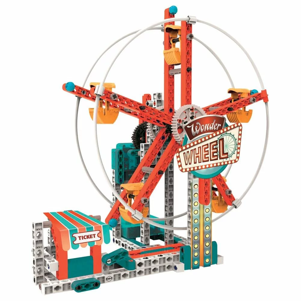 Un coffret scientifique pour recréer un véritable parc d’attractions, défier les lois de la physique et découvrir les mécanismes de façon simple et amusante. Les 250 composants permettront de créer 20 modèles dont la grande roue animée, le caroussel et bien d’autres attractions incroyables. 30 autres applications seront à découvrir sur le site Internet. Grâce à l’incroyable appli Mon Atelier de Mécanique et ses animations 3D, assembler les modèles sera encore plus facile. Le manuel détaillé et illustré te guidera dans la construction des modèles.