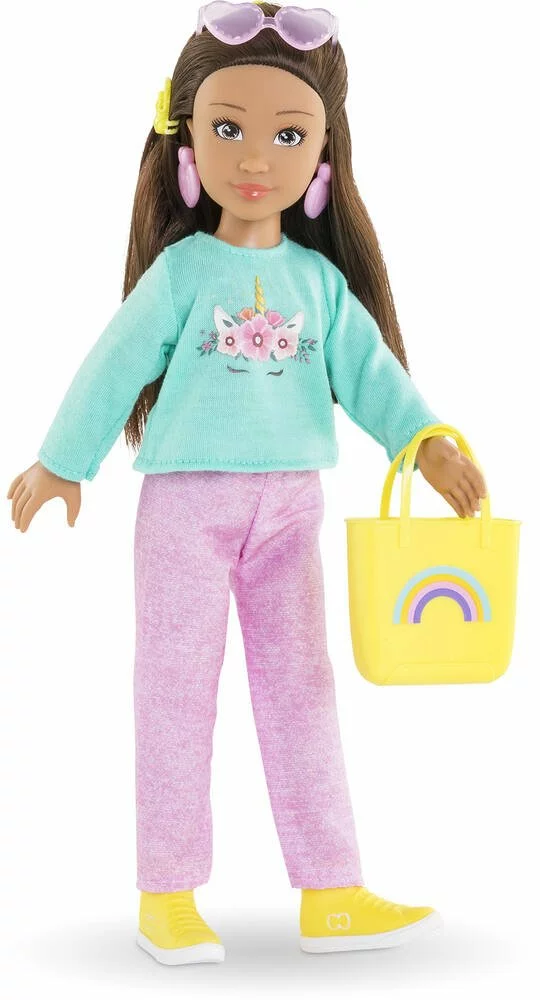 Luna a un joli visage naturel aux traits fins qui sent bon la vanille. Ses yeux sont peints et elle possède de longs cheveux bruns. Elle porte 1 pantalon rose, 1 T-Shirt manches longues imprimé, 1 paire de bottines amovibles et 1 paire de boucles d’oreille amovibles.
