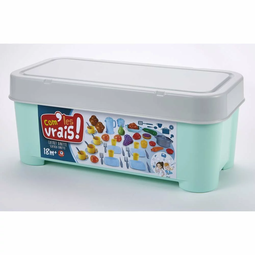 Un coffre de rangement pour la dinette rempli de viennoiseries, de fruits, de légumes, une cocotte, un service à repas, un service à thé et de nombreux accessoires. Le coffre a deux poignées de transport sur les côtés sous le couvercle. Fabriqué en plastique alimentaire, peut être lavé à l’eau savonneuse et porté à la bouche sans danger. Fabrication française. Ce set comprend 50 pièces : un coffre avec couvercle, 3 viennoiserie, 11 fruits et légumes, une cocotte avec couvercle, 1 plat, 1 poulet rôti, 4 assiettes, 4 couteaux, 4 fourchettes, 4 verres, 4 tasses, 4 soucoupes, 4 petites cuillères, 1 sucrier avec couvercle et 1 cafetière avec couvercle.