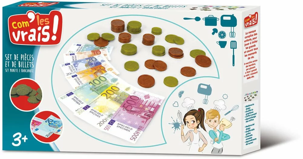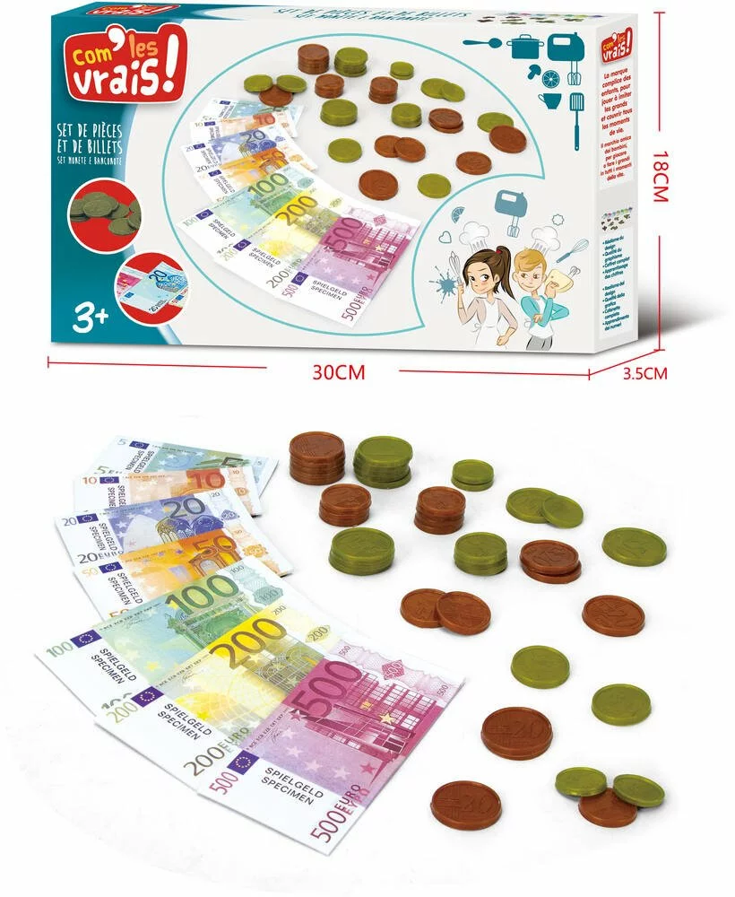 150 pièces au total. Argent factice en euros. Réaliste pour t’amuser à jouer et à compter l’argent. Imprimés double face. Avec 7 sortes de billets x 10 et 8 sortes de pièces de monnaie x 10.