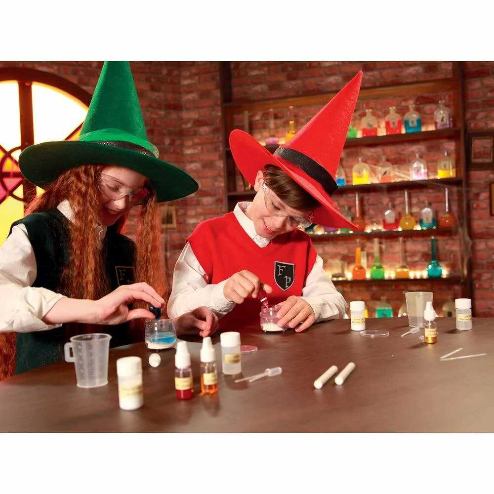 A 2 sorciers, chacun avec son chaudron, il faudra, ensemble, comprendre les formules du grimoire, manipuler les ingrédients et faire les bons mélanges pour réaliser des potions impressionnantes. Est-ce de l’huile de Mandragore ou du sang de licorne qu’il faut mélanger avec le serpent séché ? Explosions, mousses, liquide hypnotique et lampe à lave seront, entres autres, au programme des sorciers ! Comprends les formules du grimoire et manipule les ingrédients pour réaliser des potions ! Au programme : explosions, mousses ou lampe à lave ! Accessoires inclus.