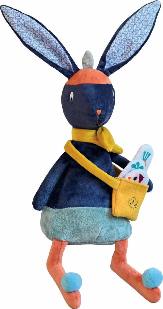 Cette peluche en velours ultra doux possède de grandes oreilles renfermant du papier bruissant. Gabin le lapin se promène toujours avec son sac bandoulière, dans lequel se trouve 3 marionnettes à doigts recto verso : carotte – brosse à dent, radis – haricot vert et chou – petit oiseau. En secouant la peluche, votre bout de chou entendra le grelot présent dans la tête de l’animal. Il pourra également retirer l’écharpe du lapin grâce au lien en velcro. Dimensions de la peluche : 45 cm. Composition : coton et polyester. Lavable à 30°.
