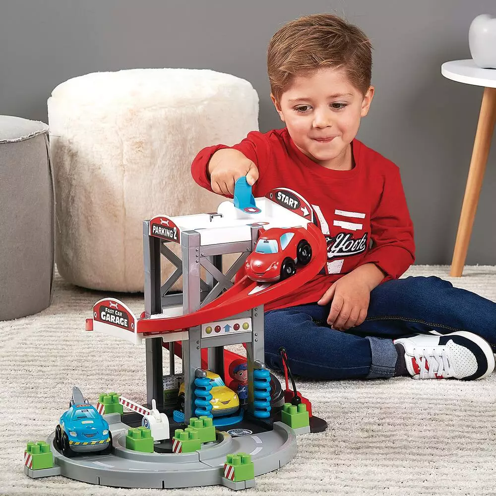 Un garage à deux étages équipé d’un personnage, d’un lanceur, d’une plaque tournante, d’une station de lavage, d’une pompe à essence et d’un circuit circulaire pour les deux voitures et la dépanneuse incluses.