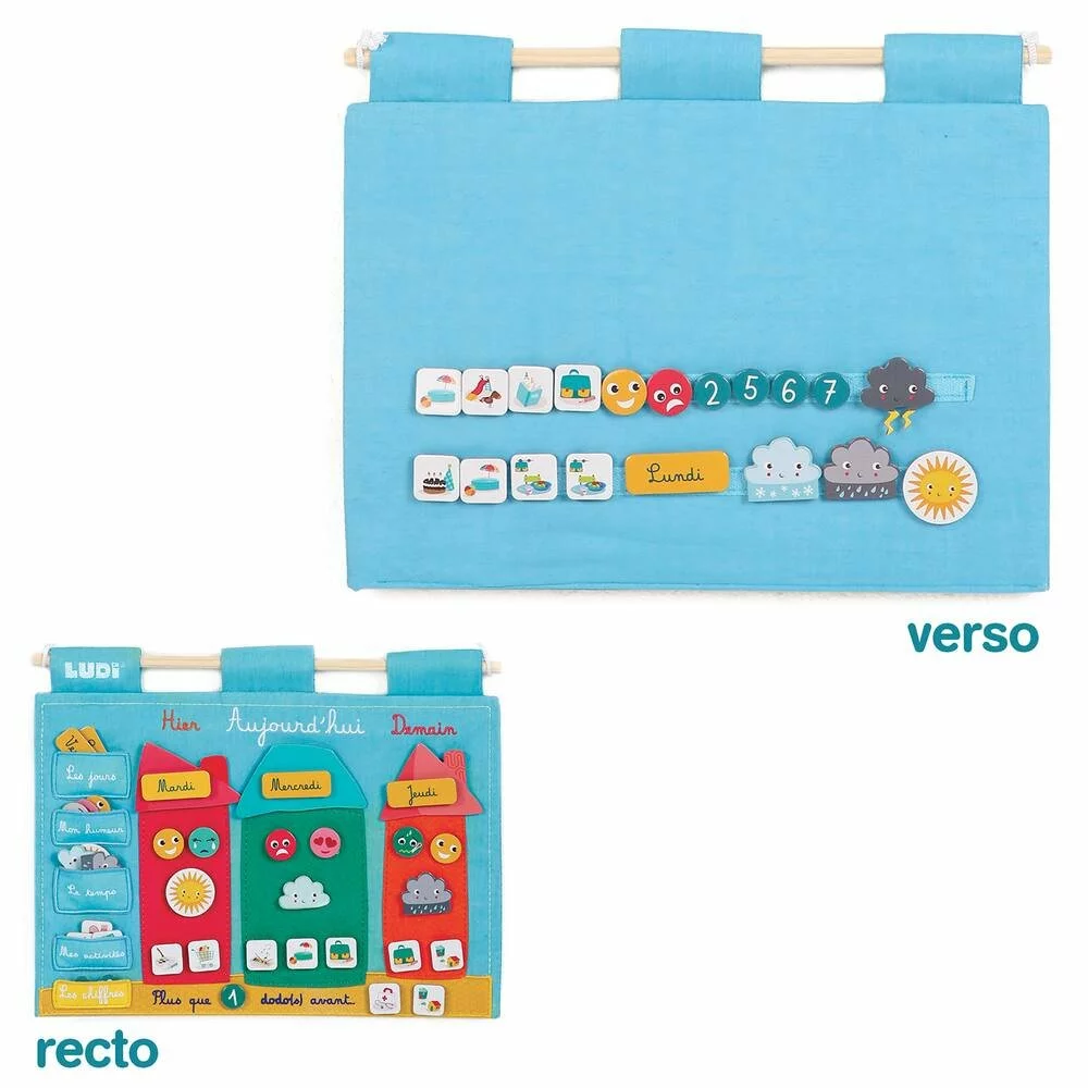 Une idée pour accompagner les enfants dans leur quotidienLe Panneau en tissu « »Le temps qui passe » » aide les petits à se repérer dans le temps grâce aux différents éléments amovibles. Les enfants peuvent suivre le cours de la semaine en notant le jour d’hier, celui d’aujourd’hui et celui de demain. Ils peuvent également préciser leur humeur, la météo et enfin toutes les activités réalisées et programmées jour après jour.Pour éviter les mauvaises surprises, les petits stress et pour aider les petits à patienter, les enfants peuvent étiqueter le nombre de « dodos » avant la prochaine activité.Accompagnés de leurs parents pour les guider, les enfants s’amuseront à organiser leur semaine et à mieux appréhender le temps qui s’écoule.Un outils astucieuxLe panneau est composé de 3 maisons « hier », « aujourd’hui » et « demain ». Les enfants piochent, dans les petites pochettes dédiées, le jour de la semaine, l’humeur qui lui correspond, la météo et ses deux activités principales de la journée. Les étiquettes amovibles sont faciles à manipuler pour les petites mains et se scratchent facilement sur le panneau. A son dos, les enfants peuvent ranger les pièces dont ils n’ont pas besoin pour ne rien perdre.L’ensemble des étiquettes amovibles : 7 jours de la semaine, 7 chiffres (de 1 à 7), 11 climats (le vent, la pluie, l’orage, la neige, le ciel nuageux, le soleil), 21 activités (l’école, la cantine, le sport, la musique, la maison, la fête, les courses, la piscine, le coloriage, etc.) et enfin 11 humeurs (joie, amoureux, colère, tristesse, malade et peur).Panneau en tissu brodé. Composé de coton et de feutrine.60 étiquettes amovibles en carton imprimé.Dimension du panneau : 38 x 30 x 1 cm.Panneau lavable avec un chiffon humide. Séchage à plat.Adapté pour les enfants à partir de 3 ans.Attention : petits éléments, danger d’étouffement.
