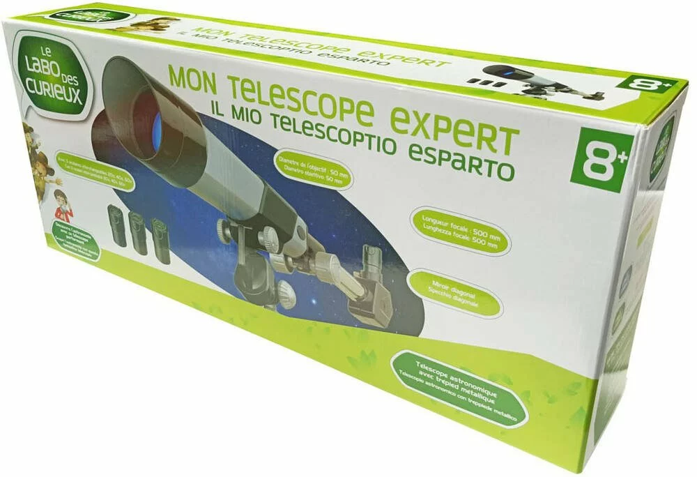 Télescope astronomique avec trépied métallique. Avec 3 oculaires interchangeables 25 mm, 12.5 mm, 8.3 mm, soit des puissances de 20x, 40x, 60x. Diamètre de l’objectif : 50 mm. Longueur focale : 500 mm. Miroir diagonal. Découvre l’astronomie avec ce télescope perfectionnant. Manuel d’instructions.