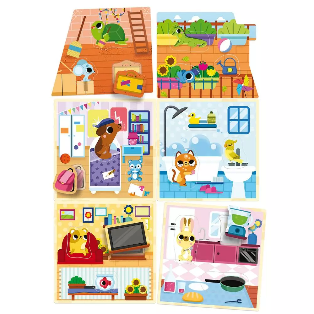 Mets chaque chose à sa place. Pour découvrir et reconnaître les animaux domestiques et un grand nombre d’objets de la maison ! L’enfant s’amusera à placer correctement les silhouettes dans la petite maison dans la petite maison et il développera sa motricité et son imagination tout en s’amusant.