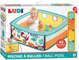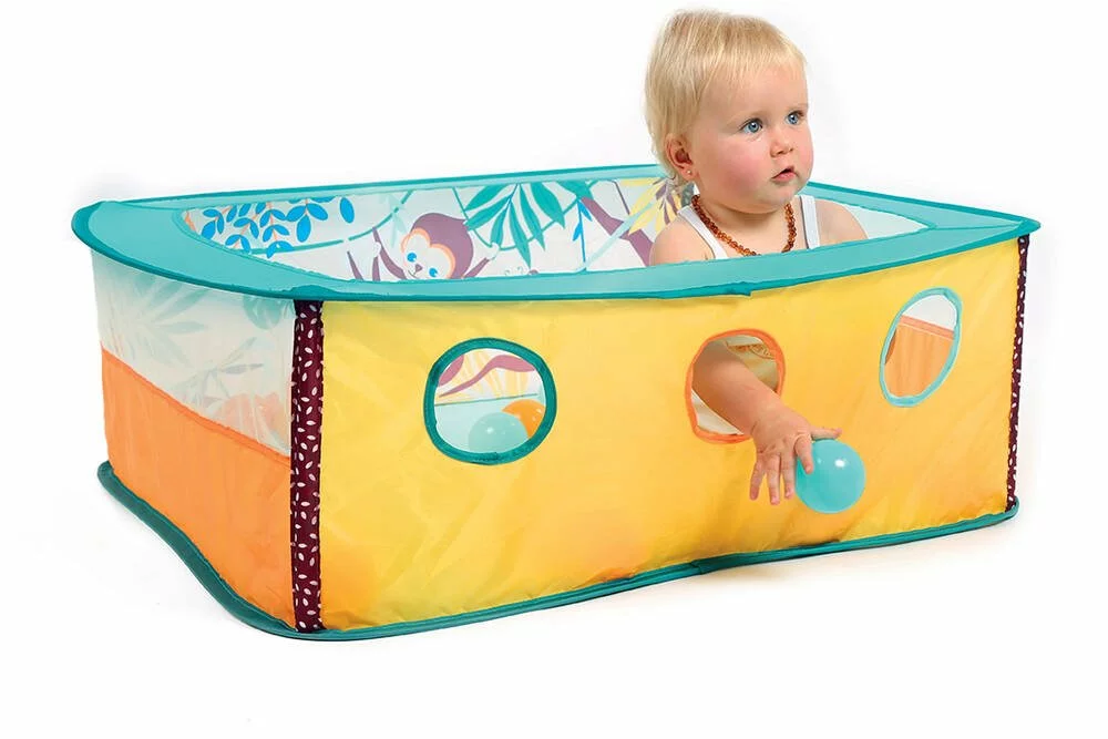 PrĂŞt en deux temps et un mouvement – La piscine Ă balle au joli thème de la jungle, dĂ©limite un espace pour bĂ©bĂ© qui pourra jouer avec les 40 balles colorĂ©es et ses jouets prĂ©fĂ©rĂ©s et faire passer les balles et ses petites mains dans les 3 trous – Nomade, cette piscine Ă balle peut se transporter partout. Sa structure pop-up et les 4 tubes, lĂ©gère et souple est très facile Ă installer ou Ă replier. En un clin d’œil, vous pourrez aisĂ©ment la ranger dans son sac de transport pour profiter des vacances ou des week-ends en famille avec bĂ©bĂ©. Ă€ la maison, vous pourrez la laisser pliĂ©e et la glisser derrière un meuble – AppliquĂ©e en espace de jeu indĂ©pendant, la structure flexible permettra aux « plus grands » d’entrer et de ressortir facilement. Pour les tout-petits capables de se dĂ©placer Ă quatre pattes, nous recommandons une surveillance des parents car les parois souples ne pourront les retenir – AdaptĂ©e pour des enfants de plus de 6 mois – Dimensions : 80 x 80 x 30 cm – Nombre de balles : 40 (6 cm de diamètre) – Nettoyage simple avec un chiffon humide.