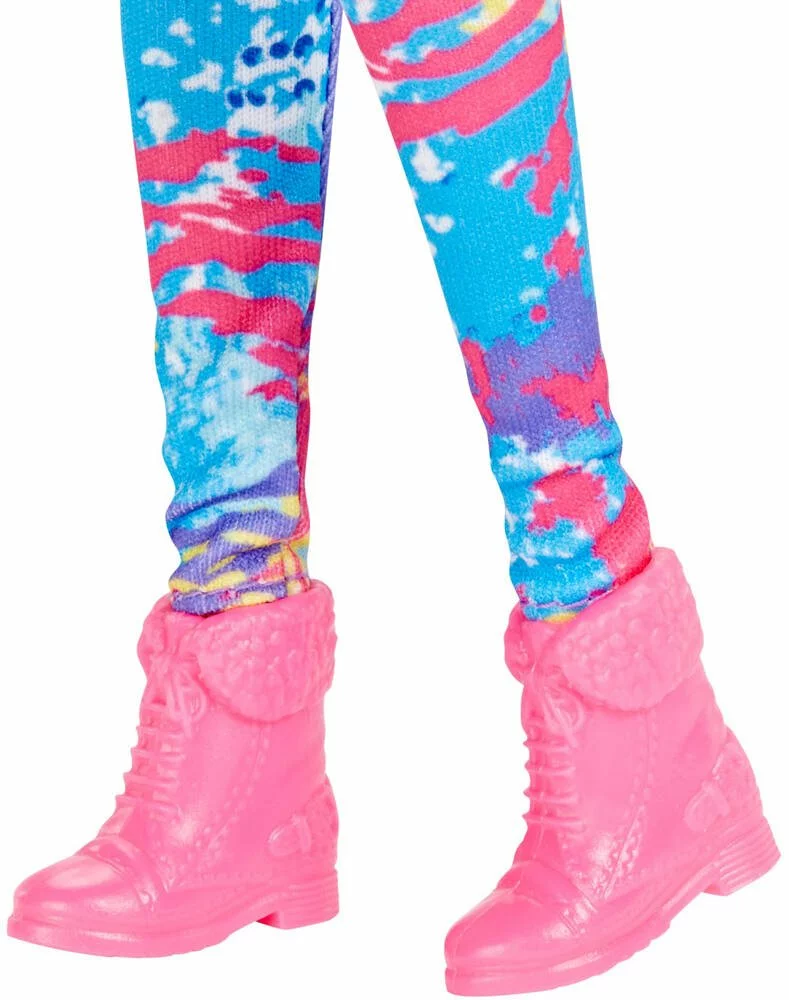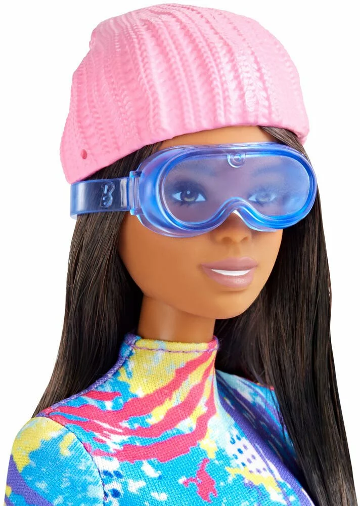 POUPEE vêtue d’une combinaison sport d’hiver colorée et d’accessoires (écharpe, masque, gourde, bonnet), prête à dévaler les pentes sur sa luge maniable.