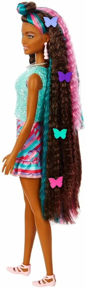 Avec ses longs cheveux noirs (22cm) aux reflets colorés et ses 16 accessoires de coiffure, Barbie s’affiche en robe multicolore parsemée de papillons.