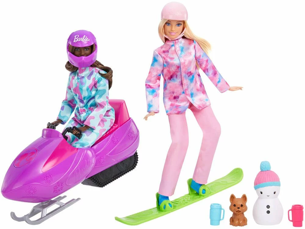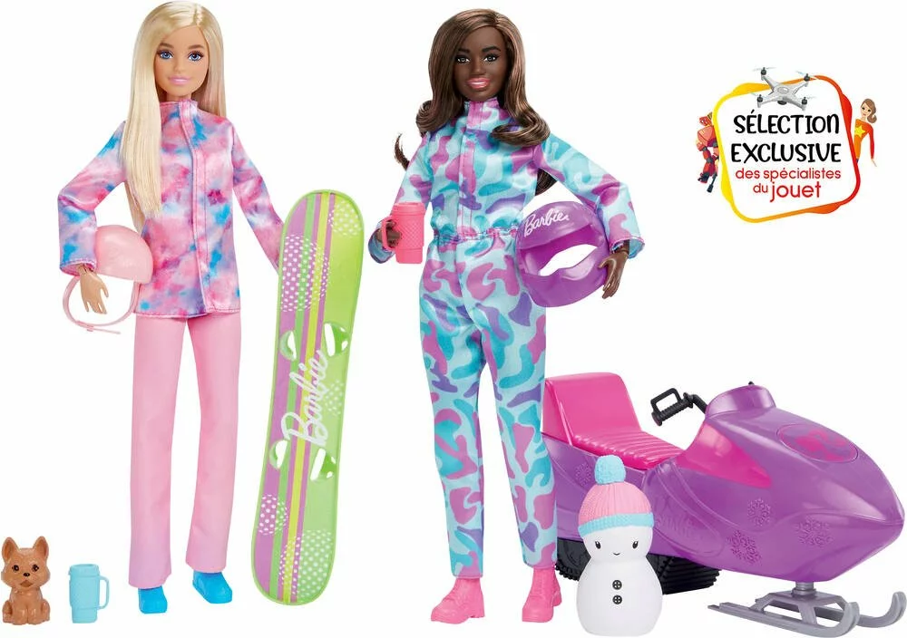 Coffret contenant deux poupées prêtes pour des activités hivernales avec une motoneige, un snowboard, un petit chiot, un bonhomme de neige et de nombreux accessoires.