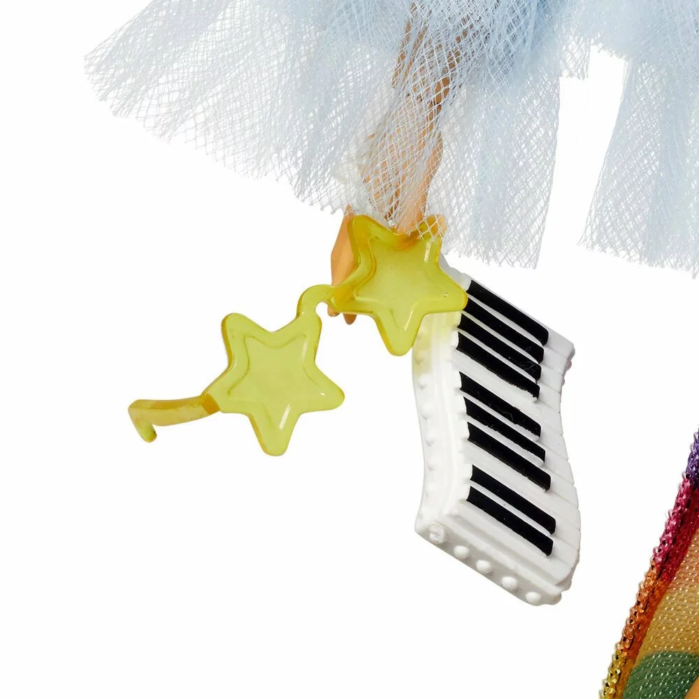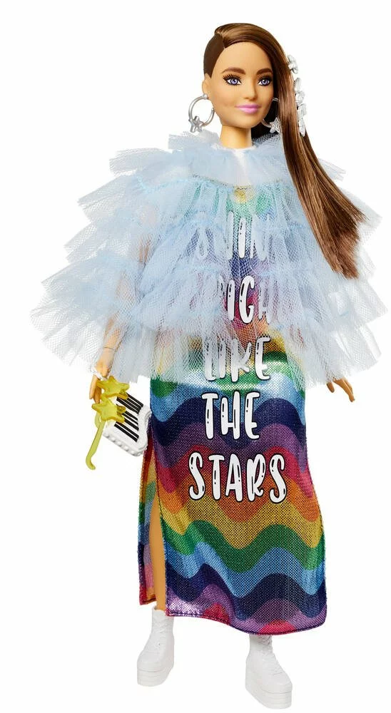 Barbie arbore une veste bleue claire à volants superposés et une longue robe multicolore. Un petit crocodile et de nombreux accessoires de mode sont inclus.