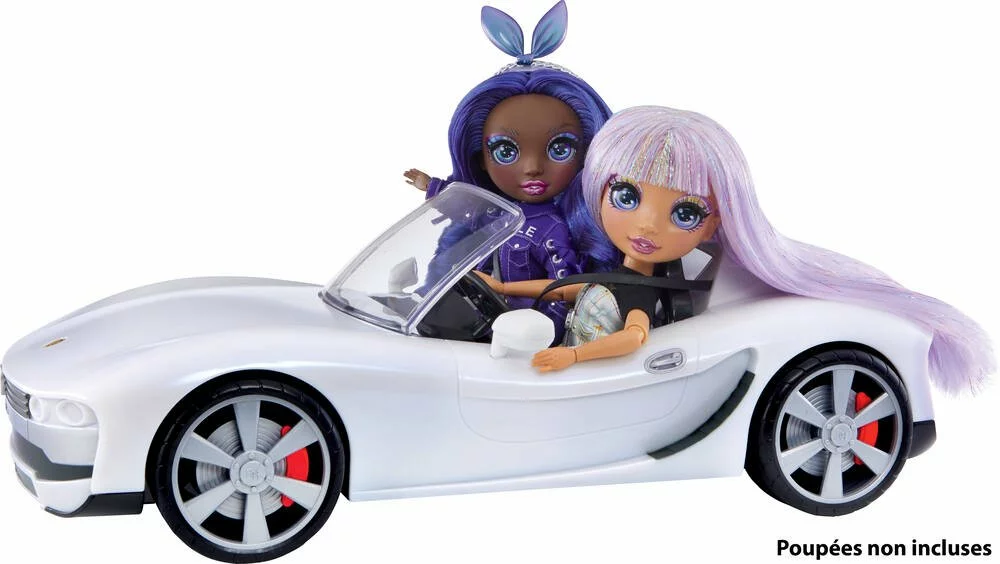 Ta voiture cabriolet équipée s’illumine aux couleurs de l’arc-en-ciel et change de couleur ! Contient 2 places et des accessoires. Poupées non incluses.