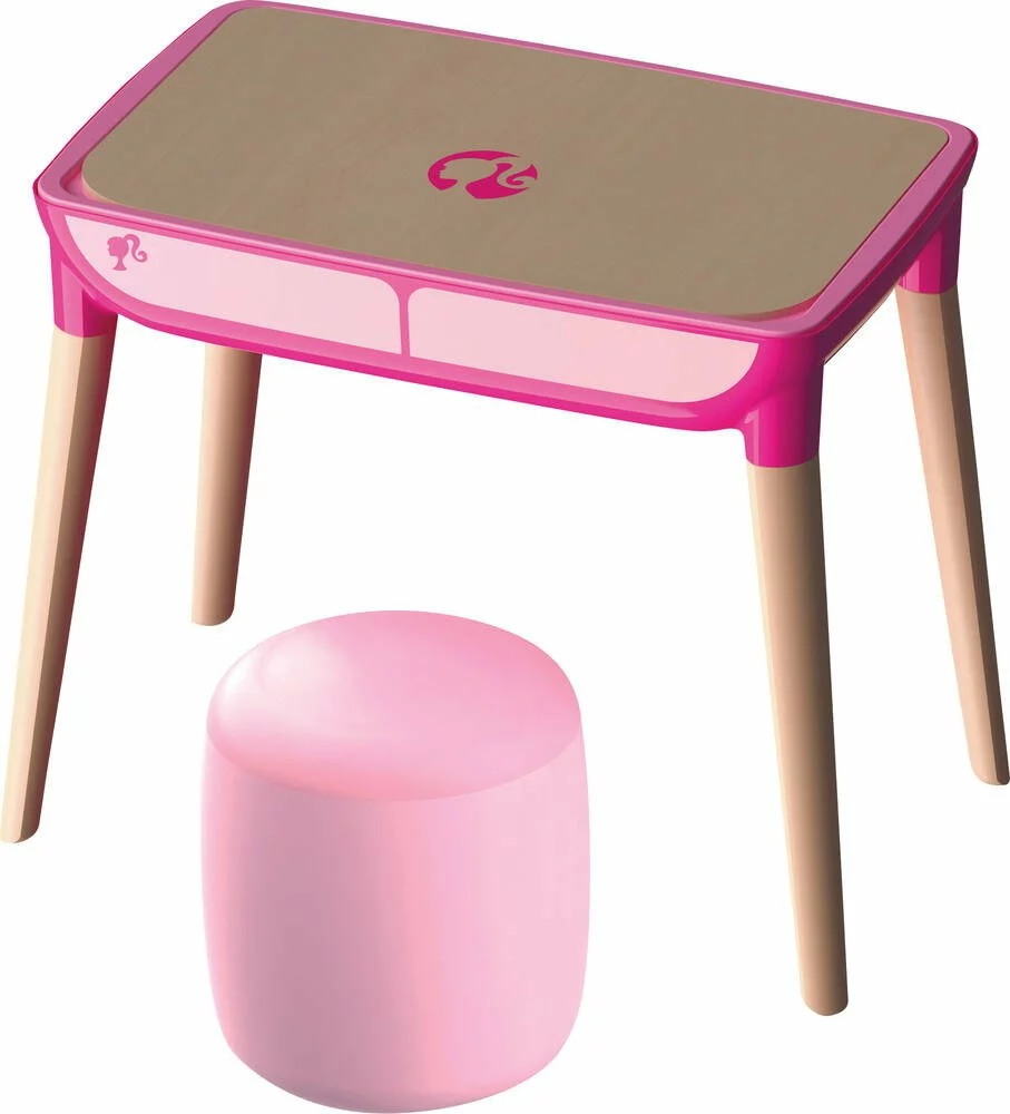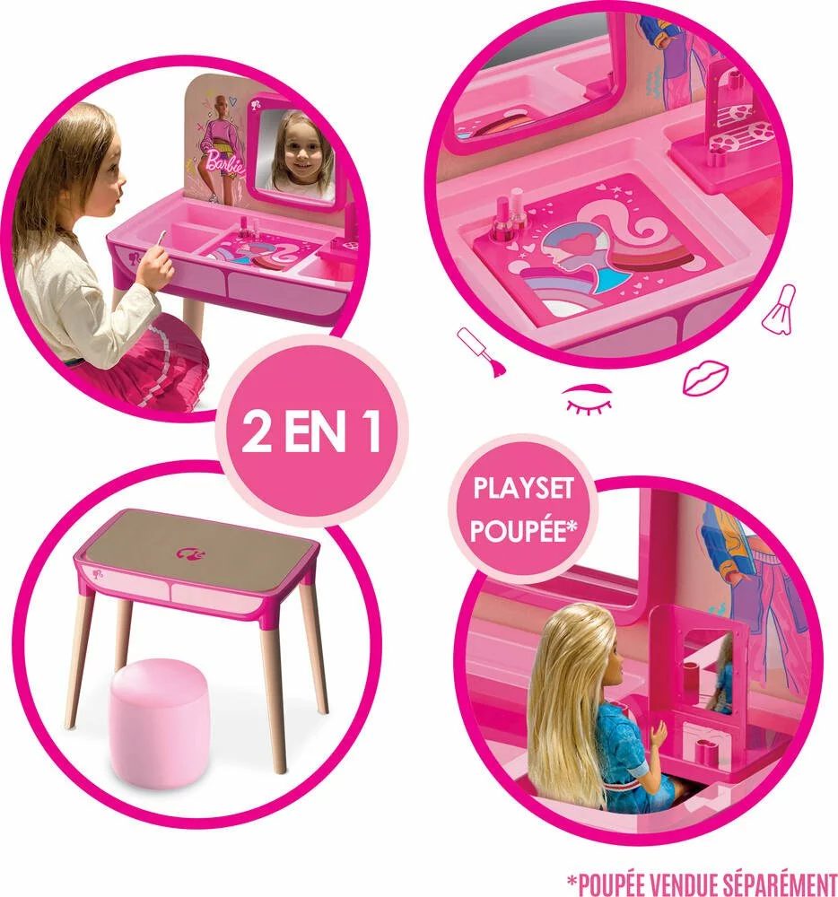 Coiffeuse double fonction : table de maquillage (hauteur : 76 cm) et table classique (hauteur : 50 cm). Comprend du maquillage d’origine naturelle : 3 blushs, 6 fards à paupières, 4 gloss, 2 vernis à ongles, 1 grand miroir et 1 siège gonflable.