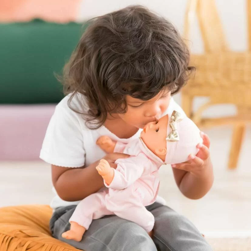 Bébé Calin Manon est un petit poupon de 30 cm; la taille parfaitement adaptée aux petits bras et mains de l’enfant pour le manipuler. Son corps souple lui permet de prendre les mêmes positions qu’un vrai bébé. Son visage; ses bras et ses jambes; à la délicate senteur de vanille; sont en vinyle doux au toucher. Avec ses yeux dormeurs; il fait dodo quand on le couche sur le dos. Il est habillé d’un pyjama et coiffé d’un bonnet assorti.