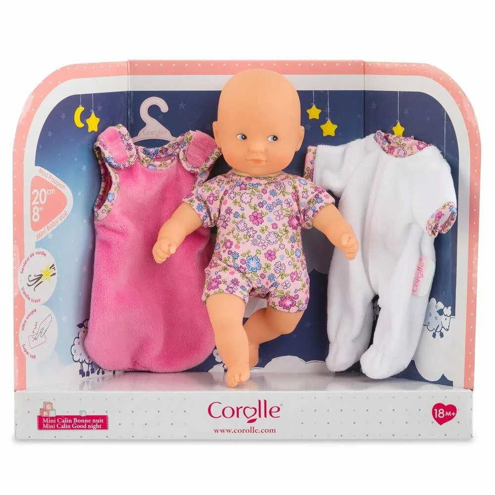 Mini Calin Bonne Nuit est un coffret composé d’un Mini Calin de 20 cm léger et facile à emmener partout, d’un pyjama et d’une turbulette. La turbulette et le pyjama sont équipés de bandes auto-agrippantes pour facilter l’habillage et le déshabillage. Le mini poupon a un visage, des bras et des jambes, à la délicate senteur de vanille, qui sont en vinyle doux au toucher. Yeux bleus peints.
