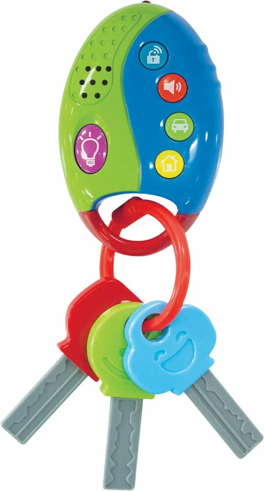 Contient 1 smartphone et un porte-clés. Avec effets sonores et lumineux. 4 piles LR03 fournies (2 pour le smartphone et 2 pour le porte-clés). En plastique. Léger et facile à manipuler. Développement de la motricité. Porte-clés : avec 4 sons de voiture et un bouton pour activer la lumière. Téléphone portable : avec 16 boutons tactiles, appuie sur les gros boutons pour entendre des sons amusants. Dimensions : téléphone 6.5 x 2.5 x 12 cm, porte-clés 6 x 3 x 9 cm, clefs 6.5 x 3 cm.