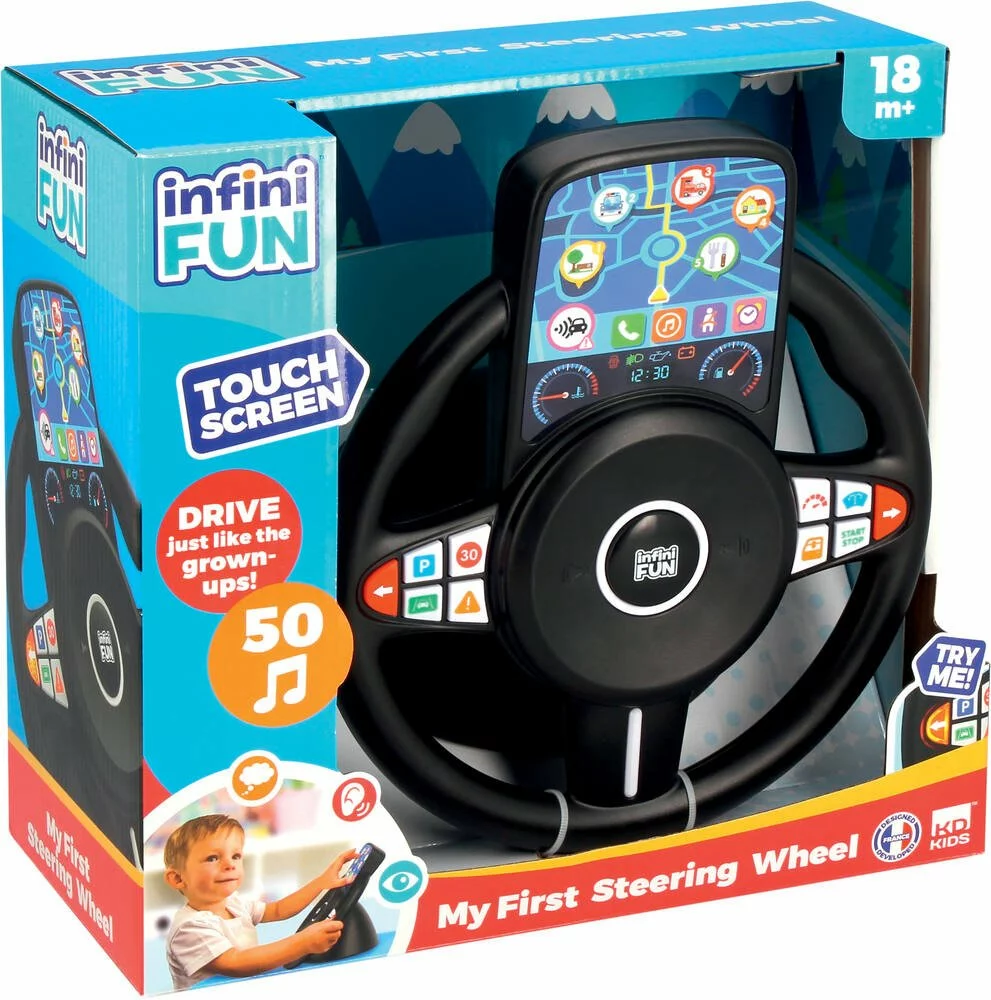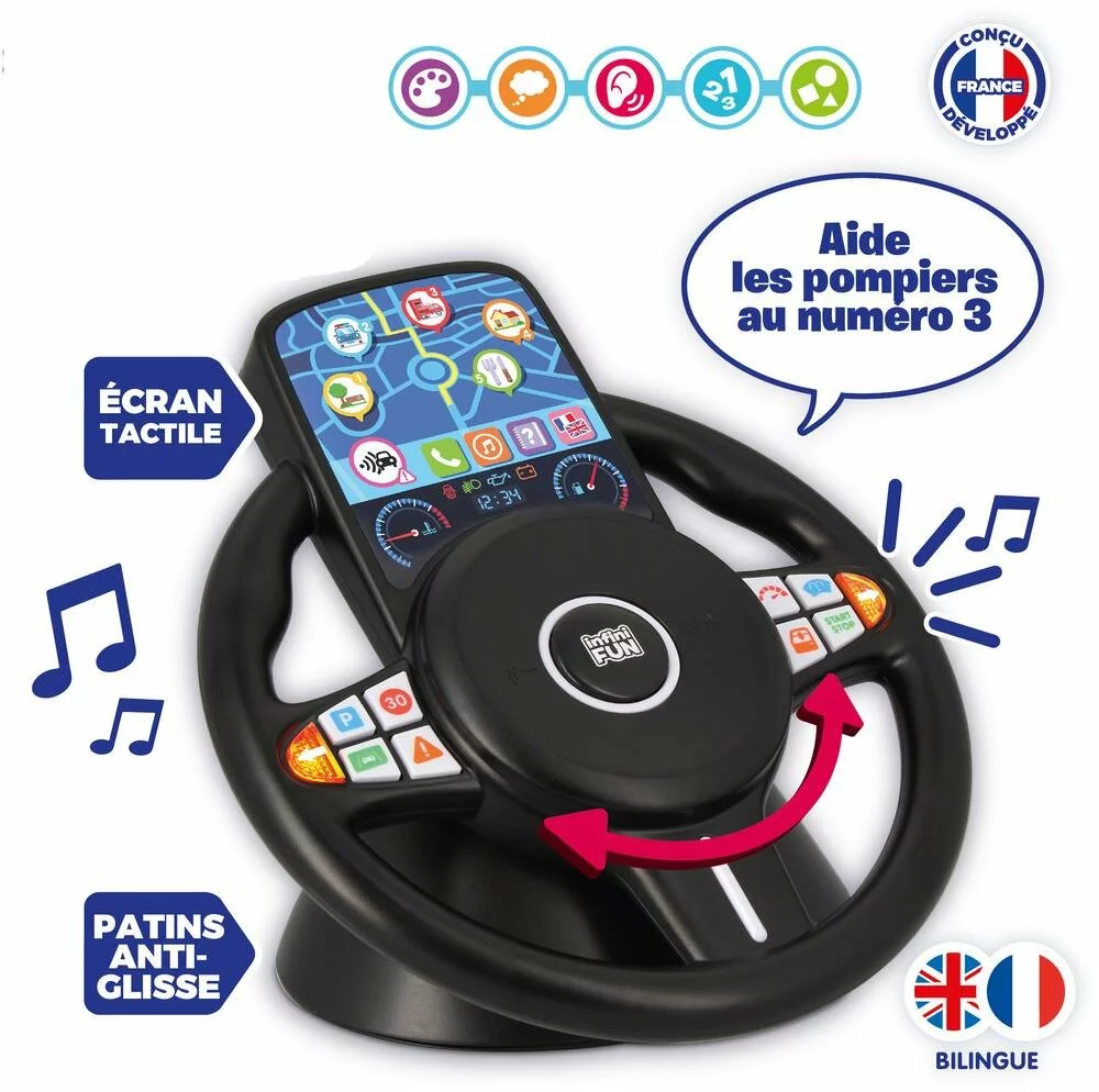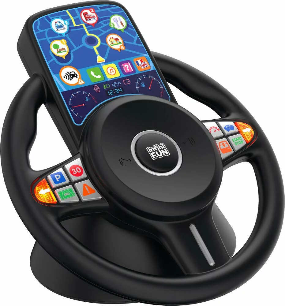 Conduis comme les grands avec ton volant interactif. 2 modes de jeux pour apprendre les nombres, les couleurs et les formes. Bilingue. Effets sonores et lumineux.