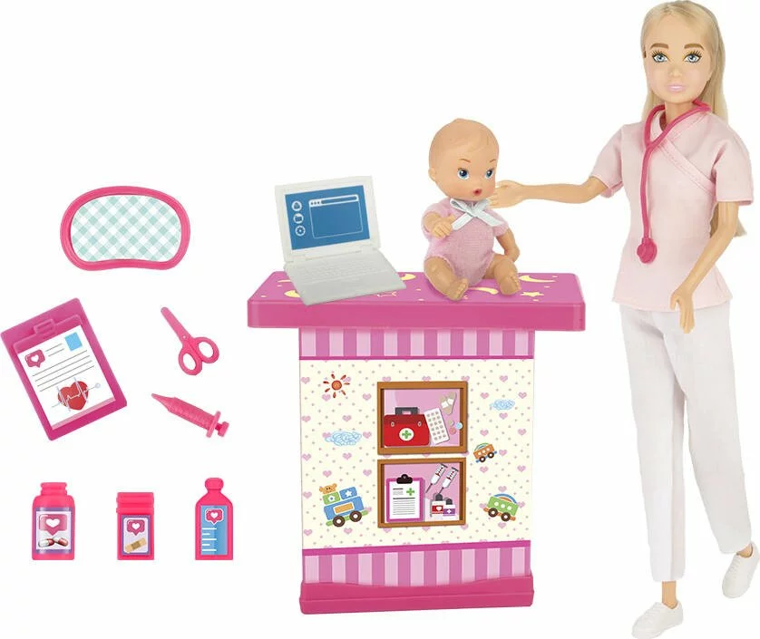 Poupée mannequin de 29 cm avec 1 bébé et des accessoires. Contenu : 1 poupée mannequin avec tenue et chaussures, 1 bébé avec tenue, 1 table d’examen, 1 ordinateur, 3 flacons de médicaments, 1 dossier médical, 1 seringue, des ciseaux et 1 plateau chirurgical. Instructions imprimées sur la boîte. Mode, sport ou voyage… Thaïs est la poupée tendance qui se révèle à travers ses passions.