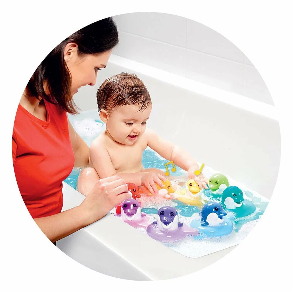 Une ronde de dauphins pour faire de la musique à l’heure du bain ! 8 petits dauphins de couleurs différentes, chacun dans sa bouée, qui s’attachent et se détachent très facilement les uns des autres. Chaque dauphin donne une note de la gamme quand l’enfant appuie sur sa tête et le fait aller sous l’eau : do, ré, mi, fa, sol, la, si, do !!! Un jouet qui familiarise l’enfant avec les notes de musique mais développe aussi la notion de relation de cause à effet et la manipulation des objets. Le tout de manière très ludique ! Ne nécessite pas de pile.