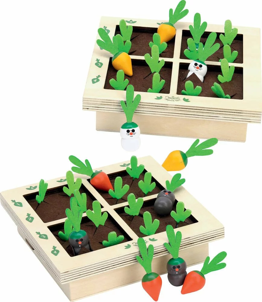 Une bataille navale originale adaptée aux plus jeunes. Le premier qui trouve les carottes de l’autre a gagné ! Avez-vous déjà vu une bataille entre carottes et taupes dans le potager ? Ce jeu de bataille navale original en bois est adapté aux plus jeunes. Chaque petit jardinier en herbe a un carré potager de 16 cases dans lesquelles il cache ses carottes et ses taupes sous la terre. Le premier qui trouve les carottes de l’autre a gagné mais gare aux taupes !!! Contenu : 2 x 12 carottes et 2 x 4 taupes. 2 carrés potager en bois et en feutrine. 2 joueurs.