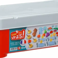 Ma caisse enregistreuse interactive – 2 – 5 ans. Une caisse parlante et interactive magique et ses 20 articles pour un shopping amusant ! Avec un écran tactile lumineux pour découvrir les nombres de 1 à 10, les aliments ainsi que leur couleur. 10 pièces de monnaie à insérer dans la fente pour régler ses achats et les compter. Une fente pour glisser la carte de fidélité et découvrir les offres du moment. Un bouton Total pour connaître le montant à régler et le nombre de pièces à insérer. Chaque aliment (raisins, fraises, lait, pain.) déclenche des phrases et sons rigolos lors du passage en caisse. Un tiroir à ouvrir / fermer pour ranger les pièces de monnaie. Plus de 160 phrases, chansons et sons amusants. Réglage du volume sonore et arrêt automatique.
