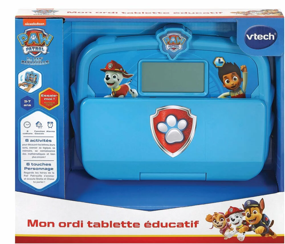 2 en 1 pour encore plus de jouabilité : Ordinateur avec clavier repliable – Tablette avec touches sensitives • 6 boutons interactifs pour jouer, découvrir et apprendre en s’amusant : l’alphabet, la phonétique, le vocabulaire, la mémoire, la logique et la météo • Boutons sur les visages des personnages pour plonger dans l’univers de chaque membre de la Pat’Patrouille ! • Écran LCD. • Support à l’arrière pour passer en mode ordi • Avec les mélodies et les vraies voix des personnages de la série !