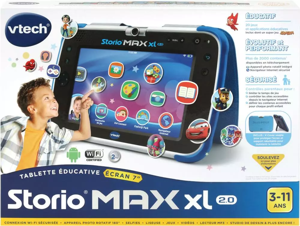 STORIO MAX XL 2.0 bleue – 3 – 11 ansLa tablette 7’’ 100% éducative change de look et devient encore plus high-tech ! Nouveau design avec couverture souple pour protéger la tablette et support pour regarder des vidéos inclus ! 2.0 : un processeur encore plus rapide ! Des performances MAX : Grand écran 7’’ capacitif, multi touch HD. Surf Internet grâce au navigateur Internet intégré et sécurisé (liste blanche). Nouveau processeur encore plus rapide sous système Android. Batterie lithium rechargeable intégrée. Mémoire interne de 8 Go extensible jusqu’à 40 Go via une carte micro SD (non inclus). Nouveau design : une smartcover souple intégrée pour plus de sécuritéAu total, 20 applications/jeux intégrés (+2 à télécharger gratuitement), dont: Kid Connect : pour garder le contact avec ses proches, en envoyant des messages (photos, vidéos, audio, dessins, textes) sur leur tablette/smartphone. Console de jeux éducatifs avec capteur de mouvement. Appareil photo rotatif (2 Mpx), album photo, studio photo. Caméscope, lecteur vidéo pour regarder des dessins animés. Lecteur de musique (prise casque ou haut parleur). Outils pratiques : horloge, chronomètre, calendrier…Contrôles parentaux : accès WiFi, gestion des sites internet autorisés, temps de jeu, profils utilisateurs. Evolutive via les cartouches de jeux Storio et plus de 2000 applications Android et autres contenus développés par VTech et par nos partenaires à télécharger sur l’Explor@ Park. Port USB. Fonctionne sur batterie lithium rechargeable (intégrée), adaptateur de recharge inclus.