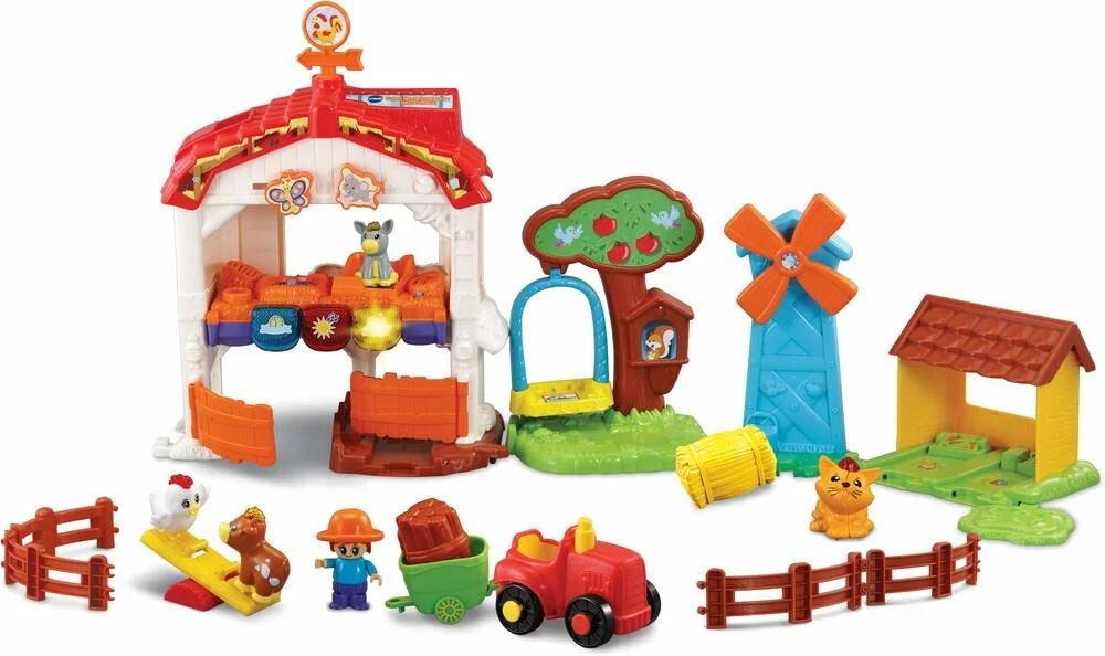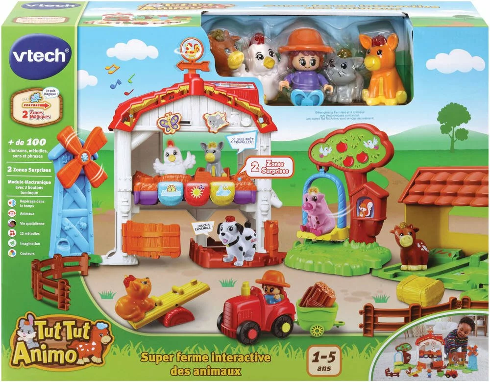 Ferme interactive et musicale avec 4 animaux, 1 fermières, 1 tracteur et de nombreux accessoires. Comprend des zones magiques et de reconnaissance. Effets lumineux.
